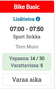 Kun ajanvarausjärjestelmässä liikuntavuoron, kuten Bike Basic, kohdalla lukee ”Vapaana: 14/30” ja sen alla ”Varattavissa: 5”, tämä tarkoittaa seuraavaa: